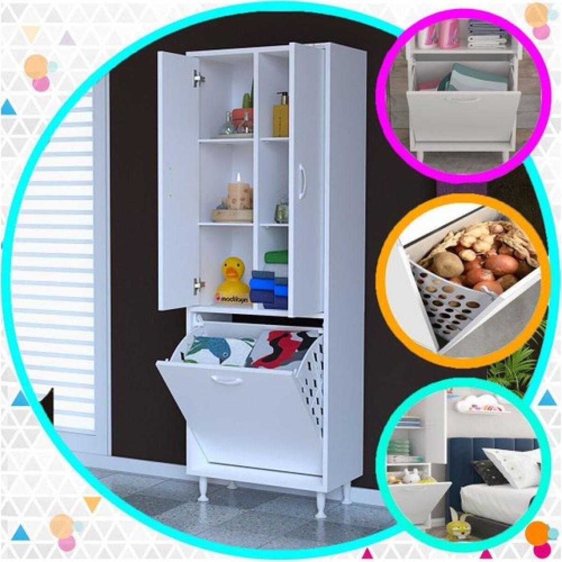 modilayn Inci 55X160 cm Üç Kapaklı Çok Amaçlı Kirli Çamaşır Dolabı Sepetli Banyo Dolabı