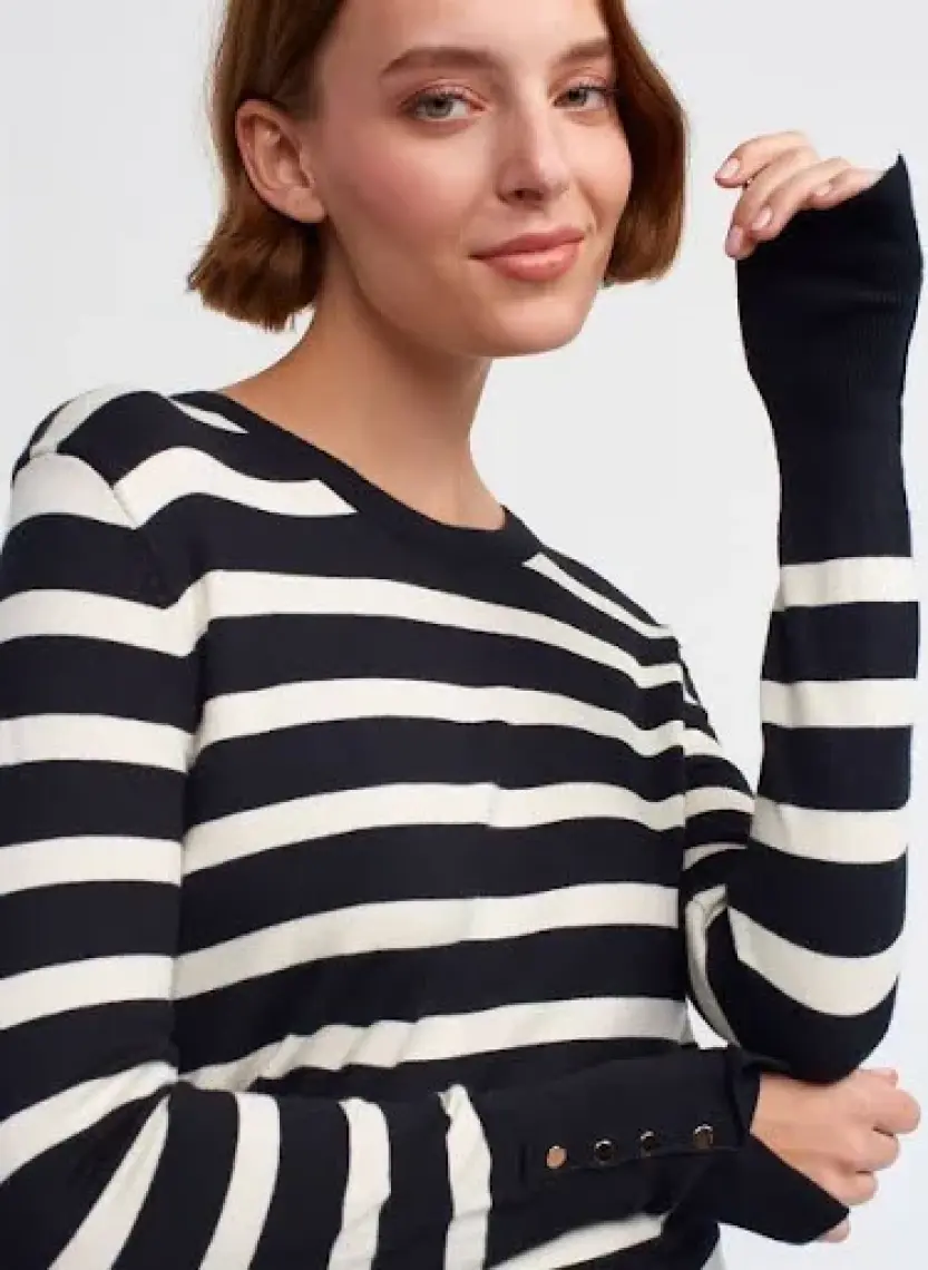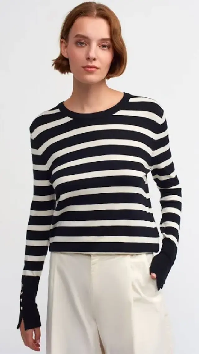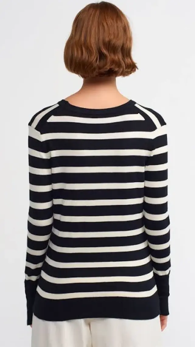 Dilvin 10433 Bisiklet Yaka Çizgili Kol Ortası Drolpu Kazak-siyah-krem